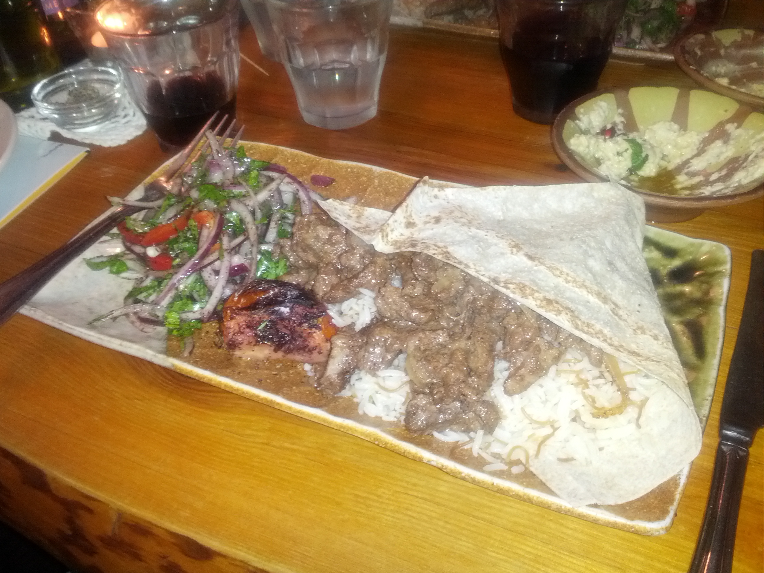 On the back wall they have a massive chalk board full of all manner of variety of wraps, mezze and other fresh produce. We mostly ordered off the main menu going for the Lamb Casserole, Lahem Meshoue and the Lamb Shawarma – (I guess we were all feeling the love of Lamb that day) The casserole possessed a fine balance of flavours, with a hints of warm spices giving a rewarding meal, the Meshoue skewers seemed less pronounced in flavours, but still ticked all the boxes, and the sheer portion size of the Shawarma could feed armies and leave them more than happy.