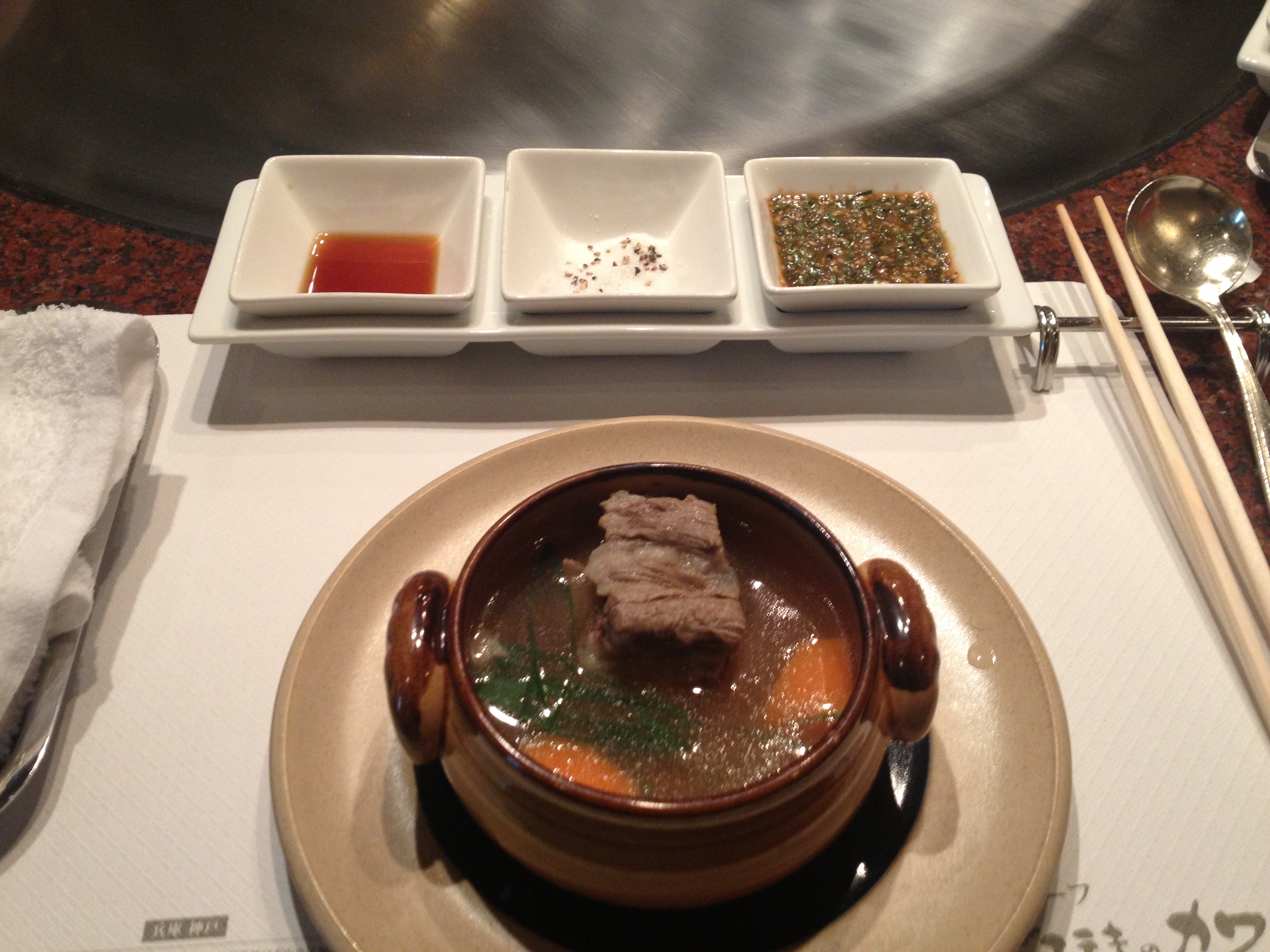 When the Sashimi came out it was a lovely site, but I have to say it was fairly average! It was nice, very rich indeed, but just didn’t have that wow factor I was expecting. We moved onto the oxtail soup which carried a succulent flavour without doubt – we were starting to head in the right direction and then when the foie gras arrived all cylinders seemed to be turning over. Every morsel grilled right in front of us, our sense filled with immense smells of rich delicious food; the foie gras was creamy and melted in seconds. The steaks themselves looked so incredibly marbled and when they hit the grill you nearly passed out it was such a sight to behold. Expertly flipped and sliced for you, the marbling melted away and became one with the pink cuts. Presented right in front you you with three sauces you tuck in with utter abandon – every bite wanting to be held for ever.
