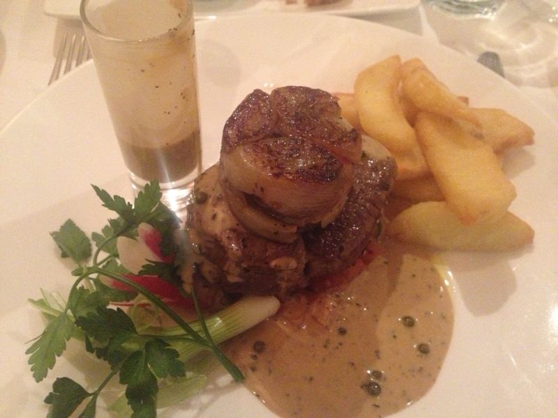 The rare beef fillet had caramelised shallots laying on it, and when combined with the crispy chunky chips and the peppercorn sauce provided a zingy pleasing dish.