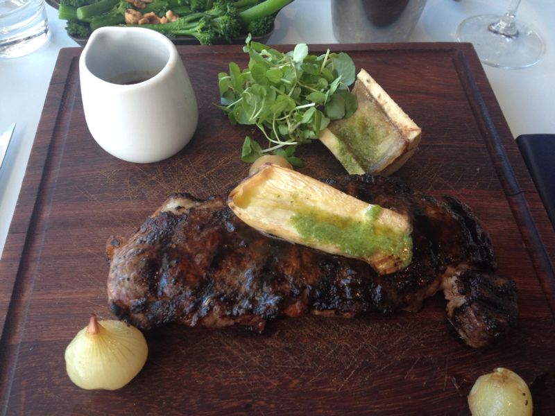 For mains the carnivores in us came to the surface so a pair of steaks one tuna, one beef sirloin and with accompaniments of some long stem broccoli showered in toasted chestnuts and some thick cut crispy fried chips. The sirloin served on wood with grilled shallots, some delicious bone marrow and a red wine sauce was pretty good. Not a top draw cut but well cooked to order by a chef that knows his trade. The tuna was just a shade overcooked with it not being massively rare as ordered, but the quality of the tuna with the new potatoes and other veg was well prepared.