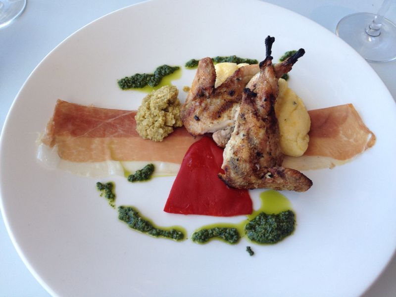 With the champagne flowing we tucked into our starters which consisted of a pair of Poussin thighs laying on a Polenta, Parma ham, pepper and pesto. A very simple dish with pleasing presentation, textures and skill on show. Alongside we chose a soft shelled crab bread-crumbed lying on a small sliver of smoked haddock and a rocket based salad. This was divine, the crab cooked perfectly and obviously well sourced and expertly cooked.